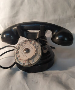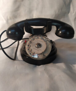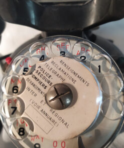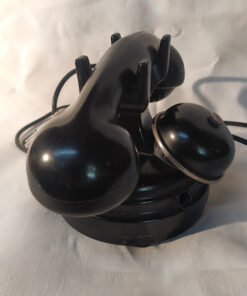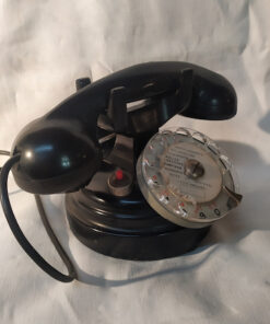 Téléphone ancien en Bakélite noire avec cadran portant un bouton poussoir de chaque côté noir et rouge (modèle de forme ronde)