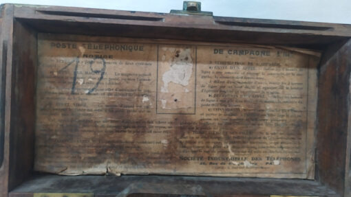 Le matériel le plus répandu à la fin du conflit est le téléphone de campagne modèle 1916. microphone, a été assemblé par Burgunder, atelier parisien implanté 48 avenue Félix Faure dans le 15e Arrondissement ainsi que le spécifie la plaque du coffret. remplacement lui même en cas de défaillance du microphone.